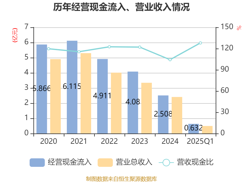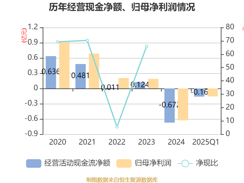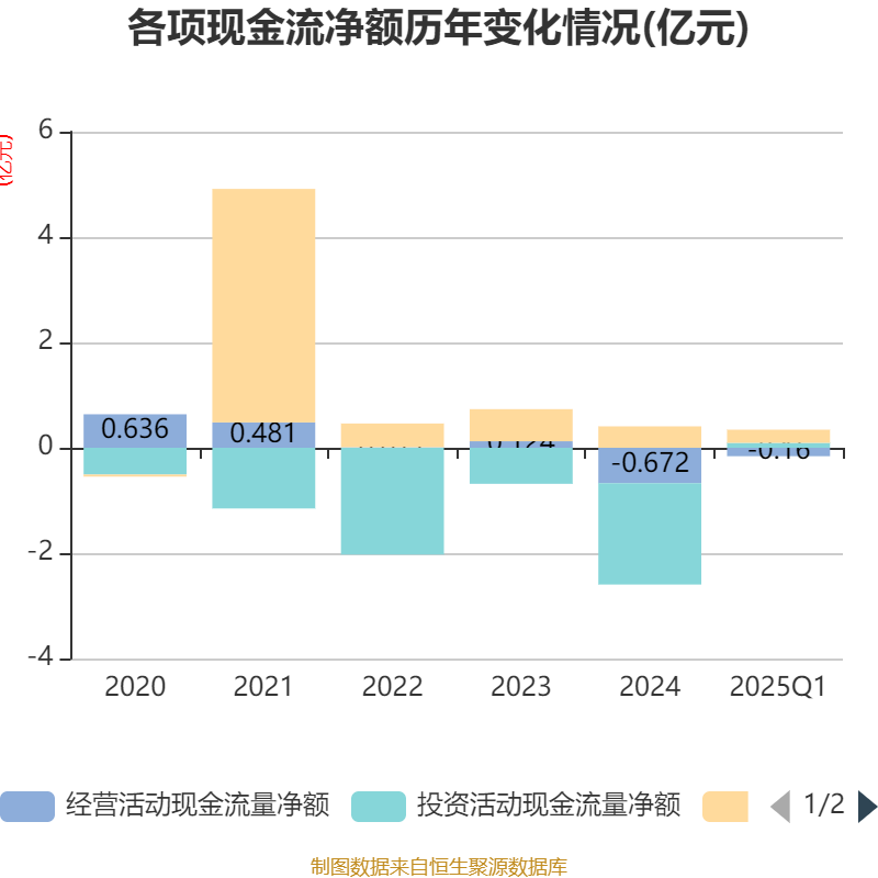 截至2025年一季度末,公司经营活动现金流净额为-1603.06万元,同比减少311.4万元;筹资活动现金流净额2493.11万元,同比减少4940.32万元;投资活动现金流净额942.17万元,上年同期为-2.23亿元。